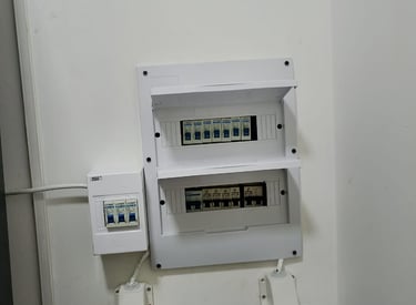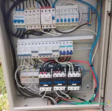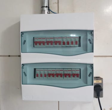 Quadros de distribuição, disjuntores, tomadas, ventiladores e chuveiros